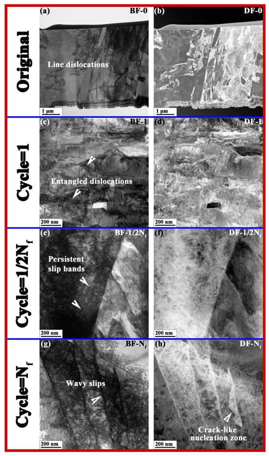 Figure 7 depicts the BF and DF STEM images of the microstructures of fatigue samples with different cycles under the 660MPa stress condition. Under bright-field conditions, dislocation structures exhibit black contrast; whereas under dark-field condition, dislocation structures exhibit white contrast. The interior of the original sample was mainly composed of strip-shaped dislocation lines, as shown in Figure 7a,b. After one cycle, a large number of densely packed dislocations were generated inside the material, and the dislocations began to entangle with each other, as shown in Figure 7c,d. A large number of obvious planar slip bands were generated inside the sample after 1/2Nf cycles, as shown in Figure 7e,f. After Nf cycles of fatigue fracture state, the internal planes of the sample formed wavy slip bands, as shown in Figure 7g,h.