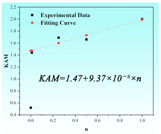 where KAM0 is the initial KAM value (not equal to 0), and is the generation rate of dislocations with respect to the simplified fatigue life n. The linear fitting results are shown in Figure 8.