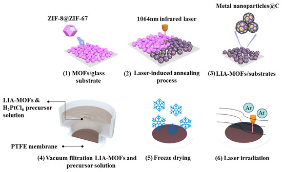 - Tang, Y.-J.; Zheng, H.; Wang, Y.; Zhang, W.; Zhou, K. Laser-Induced Annealing of Metal–Organic Frameworks on Conductive Substrates for Electrochemical Water Splitting. Adv. Funct. Mater. 2021, 31, 2102648. [Google Scholar] [CrossRef]