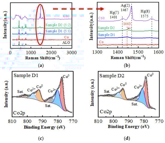 Electronic structure investigations of the films. (a) Raman spectra of the composite films compared with the alumina (ALO) substrate, pure C60 and pure Co films, and (b) the characteristic peaks of C60. The shifts of C60 Ag (2) peaks can be observed due to the electron transfer at the Co–C60 interface. (c) and (d) show the XPS analysis for the Co2p peaks of Samples D1 and D2, respectively.