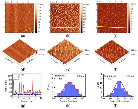 Surface morphology of the films: (a–c) 2D and (d,e) 3D AFM images for pure Co films (a,d), Sample D1 (b,e), and Sample D2 (c,f). (g) Line profile analysis of films at measurement positions marked by yellow lines in their corresponding 2D images (a–c). Size distributions of Co NPs in the composite films of Samples D1 (h) and D2 (i), respectively.