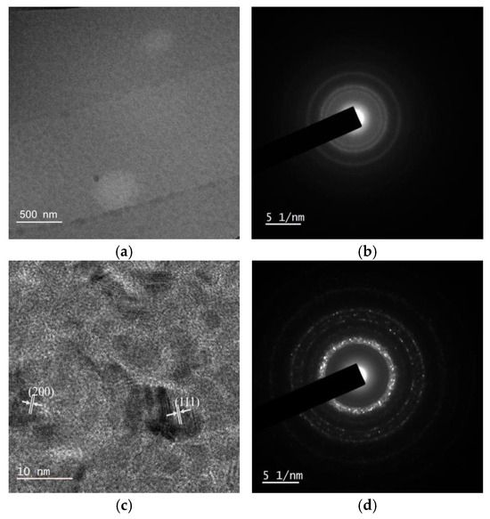 TEM images of the composite films: (a) Sample D1 and (b) the corresponding SAED pattern, and (c) Sample D2 and (d) the corresponding SAED pattern.