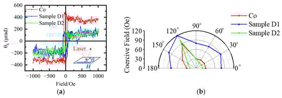 Magnetic properties of the pure cobalt film and the composite films: (a) Magnetic hysteresis loops from MOKE. The inset shows the MOKE measurements with the in-plane magnetic field. The θ is the angle between the field direction and the incident laser plane. (b) Angular dependent coercivity of the films.