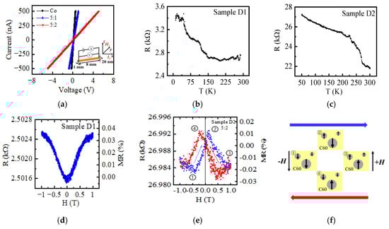 The transport properties of these films were further investigated for advanced spintronic applications, the results of which are shown in Figure 5. The I-V curves shown in Figure 5a are linear with slopes represent the film resistances, which increased from 757.6 Ω for pure Co films to 1824.8 Ω and 10,021.1 Ω for the doped films of Samples D1 and D2, respectively. The corresponding conductivity () of the films can then be calculated based on the strip geometry of 8 × 1 mm2 and thickness of 20 nm (); the detailed results are listed in Table 1. The increase of the resistance (decreased conductivity) by C60 doping is attributed to the high resistivity of semiconductive C60, as well as the increased electron scattering due to the formation of the Co–C60 interfaces (Figure 3). Additionally, the temperature-dependent resistance measurements reveal that the doped films exhibit semiconducting behavior: the resistance decreases as the temperature increases, as shown in Figure 5b,c. In metals, the conductivity relies on the motion of free electrons, and the resistance primarily stems from the lattice scattering of electrons. An increase in temperature would enhance the lattice vibrations and result in electron scattering with higher resistance [30]. In semiconductors, in contrast, the conductivity involves electron hopping, a process that can be enhanced by thermal energy [31]. The observed results indicate that the doped C60 plays an important role in the electrical transport process in the composite film.