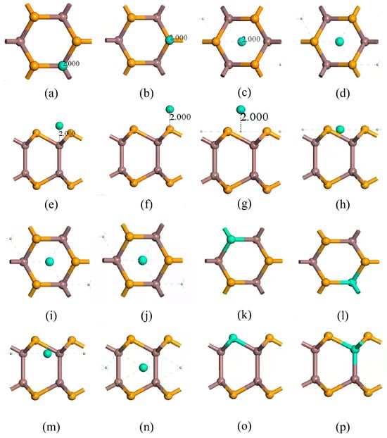 where EInSe is the energy of pristine InSe, EX is the energy of the isolated adsorbate atom, and EInSe+X is the total energy of the adsorption system. Typically, adsorption with energies above 100 kJ/mol (approximately 1.037 eV) is considered as chemical adsorption [32,59]. Chemical adsorption typically involves electron exchange or transfer between the adsorbate and substrate [60,61]. Therefore, if adsorbed atoms exhibit electronic interactions with InSe and the adsorption energy is less than −1.037 eV, we classify the adsorption as chemisorption.