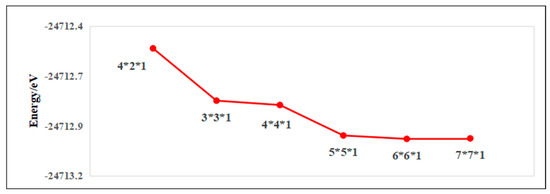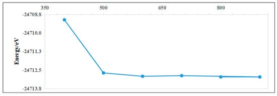 To ensure computational reliability and minimized runtime, convergence tests were conducted for key parameters, including cutoff energy and k-point sampling. Higher k-point density and cutoff energy improve total energy accuracy but increase computational load. For the Ag adsorption case on pristine InSe, convergence tests (Figure 3) revealed that a k-point mesh of 6 × 6 × 1 and a cutoff energy of 800 eV achieved sufficient energy convergence. Further refinement of these parameters yielded negligible energy changes, confirming their adequacy for balancing accuracy and efficiency. These settings were thus adopted for subsequent calculations.