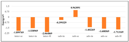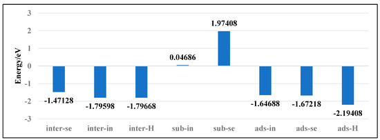 Binding energy is the energy required to bring two or more particles from a separated state to a bound state, or equivalently, the energy needed to disrupt such a bond [32]. It reflects the strength and stability of molecular or atomic interactions [10,31]. Typically, binding energy is negative, representing the energy released during the bonding process. A smaller binding energy indicates a more stable bonded configuration. After model construction and optimization, the steady-state energy and equilibrium adsorption distance were calculated to identify the most stable configuration (the state with the lowest energy). Subsequently, the binding energy was determined by computing the steady-state energies of the dopant atoms and InSe within the unit cell.