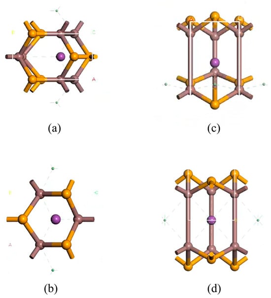 As shown in Figure 6, the Bi atom doped into the central vacancy of InSe (inter-H) exhibits the lowest binding energy of −2.06 eV. The binding energies sequentially increase for configurations including Bi adsorbed at the three-Se-atom central vacancy (inter-Se), Bi adsorbed above the central vacancy (ads-H), Bi adsorbed above Se atoms (ads-Se), Bi adsorbed at the three-In-atom central vacancy (inter-In), and Bi adsorbed above In atoms (ads-In). Notably, substitutional doping of Bi at Se sites (sub-Se) shows a positive binding energy of 0.96 eV, indicating structural instability and low feasibility. The most stable configurations are Bi doping into the central vacancy (inter-H) and three-Se-atom vacancy (inter-Se), followed by adsorption above the central vacancy (ads-H) and Se atoms (ads-Se). Less favorable configurations include adsorption above In atoms (ads-In) and doping into the three-In-atom vacancy (inter-In), with substitutional doping (sub-Se, sub-In) being the least thermodynamically accessible. Bi atoms preferentially occupy the central vacancy (inter-H) or the center of three Se atoms (inter-Se), followed by adsorption above the InSe center (ads-H) or Se atoms (ads-Se). Adsorption above In atoms (ads-In) and doping between three In atoms (inter-In) are less favorable, with substitutional doping (sub-Se, sub-In) being the least stable.