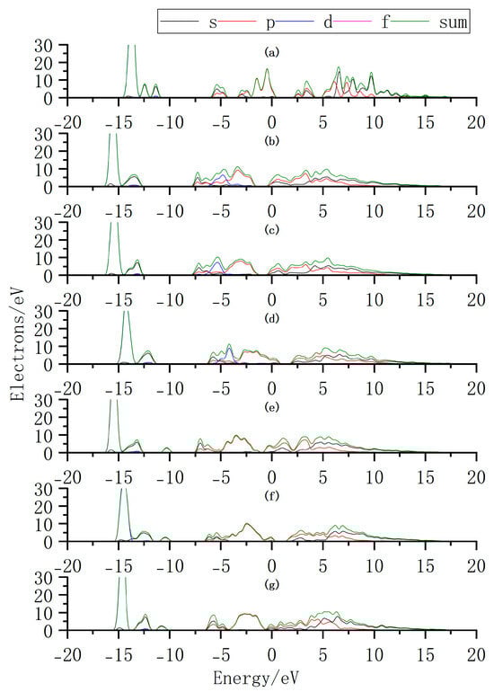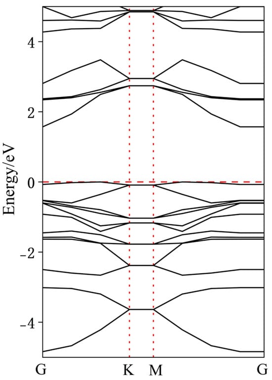 To further analyze the effects of dopant atoms on InSe, the band structures of various doped configurations were calculated. As shown in Figure 9, intrinsic InSe exhibits typical semiconductor characteristics with the Fermi level located at the mid-gap and a bandgap of approximately 1.51 eV. Due to the neglect of long-range exact exchange interactions in the GGA-PBE functional, the bandgap values calculated using GGA-PBE are inherently underestimated. To ensure the reliability of our calculations, we compared our results with those reported in existing studies. As shown in Figure 7, in the case of pristine InSe, the material exhibits clear semiconducting behavior, with the Fermi level positioned at the mid-gap and a bandgap of approximately 1.51 eV. This value closely matches the range reported in prior literature (1.26–2.11 eV), validating the consistency of our computational approach [9,17,18,19,20,21].