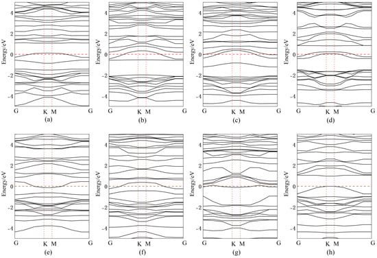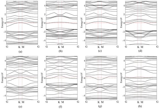 Band structures of Ag atoms in doping and adsorption configurations in InSe. (a) Ag atom adsorbed above the In atom in InSe (ads-In). (b) Ag atom adsorbed above the Se atom in InSe (ads-Se). (c) Ag atom adsorbed above the central vacancy in InSe (ads-H). (d) Ag atom incorporated into the central vacancy in InSe (inter-H). (e) Ag atom adsorbed at the center of three Se atoms in InSe (inter-Se). (f) Ag atom adsorbed at the center of three In atoms in InSe (inter-In). (g) Ag atom substitutionally doped at the Se site in InSe (sub-Se). (h) Ag atom substitutionally doped at the In site in InSe (sub-In).