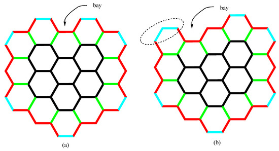 The number of triple bonds (-spe1≡spe1-) for hexagonal topologies is at least 6. It can be seen (in Figure 1 and Figure 2) that the number of triple bonds for a hexagonal flake (generated by spiral construction) is either 6 or 7, depending on the flake wall completion. If the flake has completed walls, then x = 6, since x = 6 + b, while b = 0. If the current wall is not completely built, i.e., flake has a bay x = 7, since x = 6 + b, while b = 1 [21,22]. The only exceptions from the abovementioned cases appear when a new wall starts being built, i.e., in the case when the first hexagonal cell connects to the already fully built zig-zag edge (Figure 1b). Here, it is accepted that b = 0, despite the presence of one bay. Figure 1 shows flakes with one bay (b = 1), x = 6 + b. For spiral construction, the possible values of b are 0 or 1, depending on the geometry of the flakes. Generally, in spiral construction, the parameter b can be expressed as a function of n, thus allowing a fully automatic generation. However, this is formally a bit tedious and beyond our research scope.