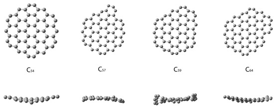 Examples of optimized geometries of the GFs C54, C57, C59, and C64 (front and side views) are given in Figure 3.