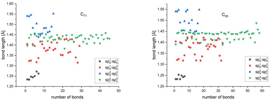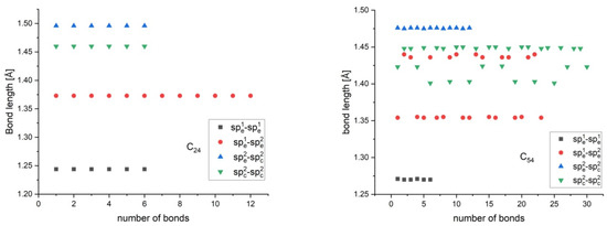 In addition, the bond length analysis of most graphene flakes also validated our assumption for 4 bond types. Normally, the spiral construction as a building algorithm starts at C6. However, we decided to start with a larger structure, namely C24. The reason for this is that the properties of the small flakes are expected to deviate significantly from those of the larger flakes. This is also evident from our results. In the case of C24, the predicted energy has the largest deviation, even though it possesses a perfect bond length separation (Figure 4). Additionally, C24 is the smallest flake in which the 4-bond type classification is reasonable. Moreover, it is known that, for some small flakes like C14, C18, and C22, the polyhex form is unstable, and after geometry optimization, it reorganizes into a large monocyclic structure [27].