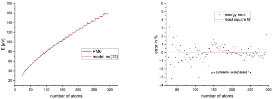 GF energies from PM6 calculations and energies predicted by Equation (12) as a function of the number of C atoms (left) and error distribution (%) as a function of size, together with the equation of the linear least square fit of error distribution (right).