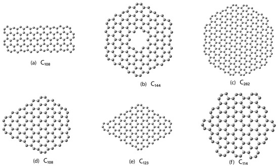 Numerical values of energy as well as errors are given in Table 2. Each of the six flakes in Figure 6 represents unique morphological features. For example, flake (a) can be seen as a nanoribbon. Flake (b) represents a flake with an internal defect. Flakes (d) and (e) can be seen as hexagonal C96, on which, in the case of (d), only one of the sides has been grown with 2 layers of cells, and, in the case of (e), two sides have been grown. The significantly larger error in the case of C144 can be explained by the fact that the internal edges are much more different from the external ones. For example, no reconstruction in the internal edges leads to triple bonding. The overall reconstruction in this region is not as dominant as in the cases with external edges. This explains why the model predicts a lower energy of such flakes compared to their actual value (Table 2).