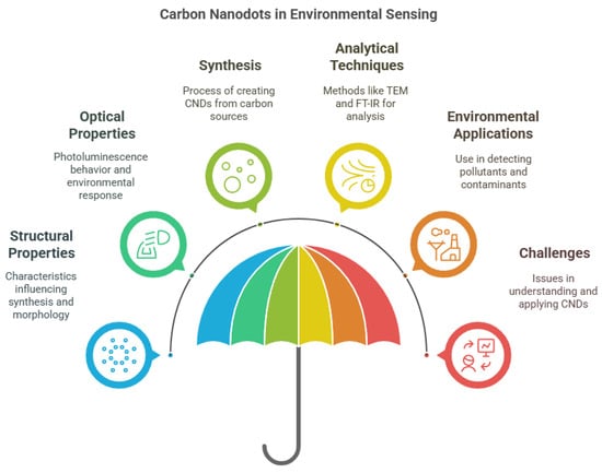 Toxic compounds such as heavy metals pose serious threats to ecosystems, human health, and agriculture []. Originating from industrial discharge, mining, wastewater irrigation, and agrochemical overuse, heavy metals persist in the environment and agriculture, leading to bioaccumulation in crops and health risks through the food chain [,,]. These chemicals can persist and accumulate over time, leading to long-term contamination that impacts not only the local agricultural areas but also distant ecosystems through runoff and atmospheric deposition []. Identifying heavy metals is essential due to their profound environmental and health effects. Metals like lead, mercury, arsenic, cadmium, chromium, copper, and nickel can cause serious health problems []. Exposure to these metals can result in both acute and chronic conditions, including neurological disorders, developmental issues, and cancers []. Heavy metals do not degrade and can accumulate in the environment, leading to soil and water pollution. This pollution can harm plants, animals, and aquatic life, disrupting ecosystems and biodiversity []. Heavy metals can build up in living organisms and become more concentrated up the food chain. Even low environmental concentrations can become highly concentrated in top predators, including humans, posing significant health risks []. These pollutants alter soil pH, reduce microbial diversity, and impair nutrient cycling, ultimately degrading soil fertility [,,]. In plants, metals like Pb, Cd, and As cause chlorosis, stunted growth, and diminished yields, threatening food security []. Early detection of heavy metals enables timely intervention and remediation [], preventing further contamination and reducing long-term health and environmental impacts []. Carbon nanodots (CNDs) have emerged as a promising tool for this purpose due to their unique properties, such as high photoluminescence, biocompatibility, and ease of functionalization [].