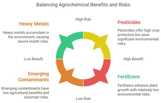 Benefits and risks of agrochemicals, including heavy metals, pesticides, emerging contaminants, and fertilizers.