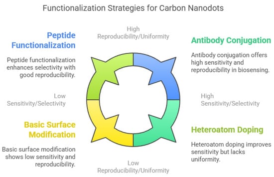 To enhance selectivity and performance, CNDs can be functionalized with molecularly imprinted polymers (MIPs), aptamers, or antibodies, which improve the binding affinity and specificity for target pollutants [].