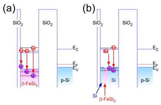 - Suemasu, T.; Negishi, Y.; Takakura, K.; Hasegawa, F.; Chikyow, T. Influence of Si growth temperature for embedding β-FeSi2 and resultant strain in β-FeSi2 on light emission from p-Si/β-FeSi2 particles/n-Si light-emitting diodes. Appl. Phys. Lett. 2001, 79, 1804–1806. [Google Scholar] [CrossRef]