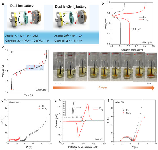 Figure 1b shows the GCD curves of the DIZIBs at 2.0 A·cm⁻2 during the initial cycle. The EL-based system delivers a specific capacity of 0.11 mAh·cm⁻2 with a coulombic efficiency (CE) of 82%. In contrast, the EL-I2 system achieves a higher capacity of 0.217 mAh·cm⁻2, albeit with a lower CE of 51%, indicating the successful operation of a DIB mechanism via I−/I3− redox activity. During discharge, both systems display a voltage plateau at ~1.25 V vs. Zn2+/Zn, corresponding to the I−/I2 redox couple characteristic of Zn-I2 batteries. On charging, the EL-I2 system exhibits additional irreversible plateaus at ~1.3 and ~1.4 V, attributed to the oxidation and conversion states of I3− species.