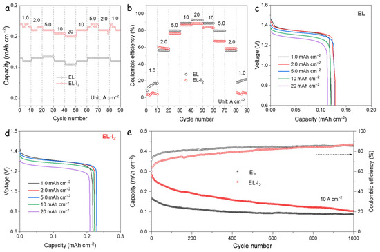 (a) Rate performance and (b) corresponding CE of EL and EL-I2 cells; (c) GCD curves of EL and (d) EL-I2 cells; (e) Cycling stability tests at 10 A·cm−2.