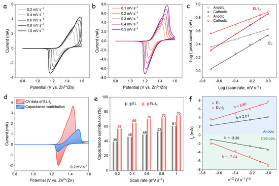 To further elucidate the differences in rate capability between the two cells, the apparent diffusion coefficient of Zn2+ and I−/I3− ions, as well as the contribution from capacitive processes, were evaluated based on CV measurements. Figure 3a,b show the CV curves of EL and EL-I2 cells at scan rates from 0.2 to 1.0 mV·s−1. Both systems exhibit well-defined cathodic and anodic peaks, indicative of reversible redox behavior. To qualitatively assess the capacitive contribution, log-log plots of peak current versus scan rate were constructed, based on Equation (1):