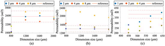 The lattice Boltzmann method (LBM) was employed to simulate fluid flow within the reconstructed porous structures [30,31,32]. Simulation parameters are listed in Table 2. Through these simulations, the effect of domain size and scanning resolution on the calculated permeability was analyzed, enabling evaluation of the REV and suitable scanning conditions. To investigate the influence of resolution, core samples from each permeability class were scanned at resolutions ranging from 1 µm to 8 µm per voxel. For each resolution level, multiple subdomains of varying size, centered at the same location, were extracted. LBM simulations were conducted in these subdomains to obtain the gas velocity field, from which permeability was calculated using Darcy’s law. The simulation results are presented in Figure 2: (1) panels (a), (b), and (c) correspond to the permeability results for ultra-high-, high-, and medium-permeability samples, respectively; (2) blue, red, and yellow symbols represent results at scanning resolutions of 2, 4, and 8 µm/voxel, respectively; and (3) due to the smaller pore size of the medium-permeability samples, additional scans were performed at 1 µm/voxel.