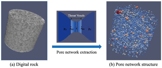 To further investigate the connectivity of the microporous structures and the characteristics of fluid flow within them, a pore network model was constructed using a pore structure segmentation method, as illustrated Figure 3. The left panel of the figure shows the grey images of rock sample. In this image, the gray regions represent the rock matrix composed of various minerals, the black regions within the matrix correspond to the pore spaces, and the black area outside the matrix denotes the image background. The segmentation method simplifies the complex porous structure into a network of pore bodies (modeled as spheres) and pore throats (modeled as cylinders), based on the local pore-throat geometry. This approach, shown in the right panel of Figure 3, is rooted in the foundational theory proposed by Fatt [33] and has undergone significant refinement over the past two decades, becoming a widely adopted technique for constructing pore network models.