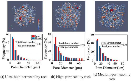 In the pore network diagrams, pore bodies are represented as spheres, with their size and color indicating the pore radius. The lower panels of Figure 4 present the percentage distributions of pore bodies and pore throats for each sample, shown as red and blue bars, respectively. Characteristic parameters of the pore structures, extracted from these models and illustrated in Figure 5, reveal that the ultra-high-permeability reservoir features a wide range of pore sizes—from 10 µm to 130 µm in diameter—with a peak distribution around 50 µm. This sample also exhibits high pore-to-throat connectivity, with a total throat-to-pore ratio of 3.81. It is important to note that the pore size distributions shown in Figure 5 represent the combined size distribution of pore bodies and throats in Samples 2, 4, and 5, which correspond to the ultra-high-, high-, and medium-permeability reservoir rocks, respectively. As permeability decreases, high-permeability sandstones show a narrower pore size distribution (10 µm to 80 µm in diameter, with a peak around 32 µm) and more refined pore throats, resulting in a lower throat-to-pore ratio of approximately 2.76. Medium-permeability reservoirs are characterized by a greater abundance of smaller pores and throats, with pore sizes clustered around 18 µm, and a further reduction in the throat-to-pore ratio to approximately 2.71. This decrease in throat dimensions generally leads to reduced permeability.
