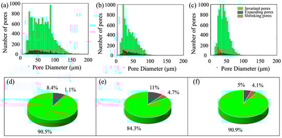 Evolution of porous structure during long-term flooding, (a–c) for the number of pores with size variation for ultra-high-permeability, high-permeability and medium-permeability rocks, respectively, and (d–f) for the corresponding quantity percentage of pores with size variation.