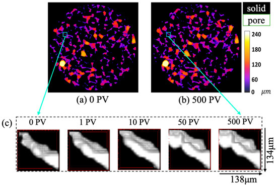The local variation of pore structure in Sample 2 with ultra-high permeability: a planar view of the diameter of each pore at (a) the initial stage (0 PV), and (b) the final stage (500 PV), where the colored variation represents the pore diameter distribution in the local pore structure. Subfigure (c) shows a 3D view of the local pore structure with domain size 134 × 138 μm from 0 PV to 500 PV, where the black part stands for the solid matrix and the white part for the pore space.