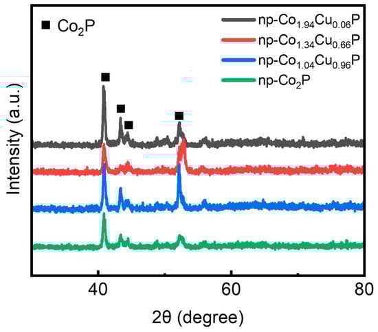 The np-Co2−xCuxP catalyst was prepared by selectively etching the Co phase from the Co-Cu-P precursor alloy (Figure S1). The Co-Cu-P precursor alloys were prepared by melt-spinning method. The precursor alloys with designed compositions were melted into liquid state in quartz tubes and then ejected on a rotating copper roller to realize rapid cooling. During the solidification process, the Cu atoms trends to alloy with metallic Co and dope into the Co2P in the nucleation and growth process, forming the metallic Co phase, Co0.52Cu0.48 alloy phase and Co2P phase in the precursor alloy. The phase compositions of these precursor alloys were examined by X-ray diffraction (XRD). As shown in Figure S3, the diffraction peaks located at 44.4°, 51.5°, and 75.9° are attributed to metallic Co, while peaks at 41.1°, 43.2°, and 52.3° correspond to the Co2P phase [25,26,27]. With increasing Cu content, additional peaks at 50.6° and 74.3° emerge, which can be assigned to the Co0.52Cu0.48 alloy phase [28,29]. This indicates that Cu atoms gradually occupy the lattice sites of Co, forming a solid solution alloy phase when the Cu content becomes sufficiently high. Compared with the binary Co80P20 precursor, the Cu-doped samples show no significant phase difference at low Cu contents; however, a noticeable increase in the intensity of Co0.52Cu0.48-related peaks is observed at higher Cu loadings, suggesting enhanced alloying behavior for Cu. After electrochemical dealloying, the Co and Co0.52Cu0.48 alloy phases are selectively dissolved, forming a porous Co2P structure (Figure 1). The complete disappearance of metallic Co and Co0.52Cu0.48 peaks confirms their full removal during dealloying. This process is critical for generating high surface area and accessible active sites [25]. Figure S4 shows the enlarged XRD patterns focusing on the (201) plane of Co2P for all samples. A clear shift of the diffraction peak towards lower angles with increasing Cu content is observed, indicating a lattice expansion due to the incorporation of Cu atoms, which possess a larger atomic radius than Co. This confirms the successful substitutional doping of Cu into the Co2P lattice, leading to the modulation of its crystal structure. Therefore, Co not only facilitates the formation of a dealloyable structure but also indirectly influences the final composition and morphology of the catalyst.