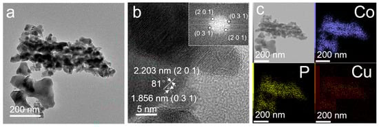 To gain deeper insights into the morphology, phase composition, and elemental distribution of the np-Co1.34Cu0.66P, transmission electron microscopy (TEM) and energy-dispersive X-ray spectroscopy (EDS) analyses were conducted. As shown in Figure 3a, the TEM image reveals a hierarchical porous structure, consistent with the SEM observations. The high-resolution TEM (HRTEM) image and FFT patterns in Figure 3b displays well-defined lattice fringes with interplanar spacings of 2.203 Å and 1.856 Å, corresponding to the (201) and (031) planes of Co2P, respectively. The FFT pattern shows two pairs of centrosymmetric diffraction spots, corresponding to the (201) and (031) planes of Co2P, which further confirms the good crystallinity and specific orientation of the sample [30,31]. The measured angle between these two planes is approximately 81°, which aligns well with theoretical values, further confirming the Co2P phase of the material. Elemental mapping via EDS (Figure 3c) shows a homogeneous distribution of Co, P, and Cu throughout the porous framework, indicating that Cu atoms are uniformly doped into the Co2P lattice.