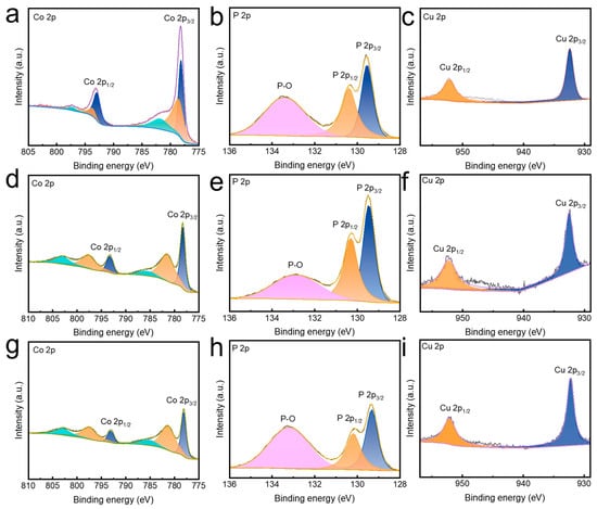 XPS spectra of (a–c) Co 2p, P 2p, and Cu 2p for np-Co1.94Cu0.06P, (d–f) Co 2p, P 2p, and Cu 2p for np-Co1.34Cu0.66P, and (g–i) Co 2p, P 2p, and Cu 2p for np-Co1.04Cu0.96P.