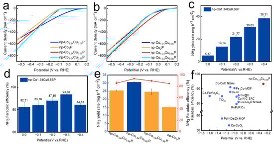 (a) LSV curves of np-Co2−xCuxP catalysts in 1 M KOH; (b) LSV curves in 1 M KOH + 0.1 M NaNO3; (c) NH3 yield and (d) Faradaic efficiency of np-Co1.34Cu0.66P at different applied potentials; (e) NH3 yield and Faradaic efficiency of np-Co2−xCuxP at −0.3 V; (f) Comparison of Faradaic efficiency with recently reported high-performance NO3RR catalysts.