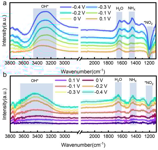 To further explore the enhanced mechanism caused by Cu doping, in situ ATR-SEIRAS was conducted to monitor reaction intermediates. As shown in Figure 6, the spectra of np-Co2P and np-Co1.34Cu0.66P display characteristic peaks at 1209, 1438, and 1632 cm−1, corresponding to *NO2, *NHx, and H2O species, respectively [11,47,48,49]. For np-Co2P, the *NHx signal emerges at −0.2 V and strengthens as the potential becomes more negative, indicating progressive reduction of nitrate. The presence of *NO2 at 0.2 V implies that Co2P enables nitrate activation at low overpotential, but insufficient hydrogen availability results in incomplete reduction and byproduct formation. In contrast, the *NHx signal for np-Co1.34Cu0.66P appears at 0 V, suggesting improved conversion of *NO2 to *NHx due to Cu incorporation [50,51]. Moreover, a blue shift in the O-H stretching vibration (from 3300 to 3400 cm−1) indicates enhanced water dissociation on the Cu-doped surface, leading to more active hydrogen species that facilitate nitrate hydrogenation and promote catalytic activity [52,53,54].
