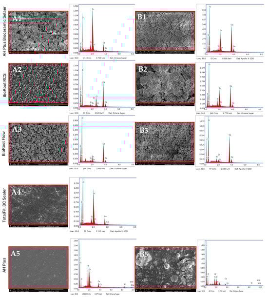 - Reszka, P.; Nowicka, A.; Dura, W.; Marek, E.; Lipski, M. SEM and EDS Study of Totalfill BC Sealer and Guttaflow Bioseal Root Canal Sealers. Dent. Med. Probl. 2019, 56, 167–172. [Google Scholar] [CrossRef] [PubMed]