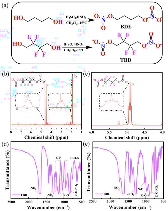 The synthesis of TBD: A 250 mL three-neck flask was charged with concentrated H2SO4 (98%; 40 mL), dichloromethane (DCM; 5.6 mL), and HNO3 (67%; 0.2 mL) under continuous stirring. Tetrafluorobutane-1,4-diol (3.24 g; 20 mmol) was finely pulverized and gradually introduced into the reaction system. The mixture was cooled to −15 °C using an ice–salt bath and supplemented dropwise with HNO3 (6.0 mL) over 40 min using a pressure-equalizing dropping funnel. Subsequently, DCM (2.0 mL) was added, and the mixture was warmed to ambient temperature (25 ± 2 °C) and magnetically stirred for 24 h. The resulting mixture was slowly poured into an ice–water slurry (120 mL). The organic phase was washed with a saturated aqueous NaHCO3 solution, dried over anhydrous MgSO4, and concentrated under reduced pressure using a rotary evaporator to obtain TBD as a viscous pale-yellow [21] liquid (2.42 g; 9.6 mmol; 48% yield).