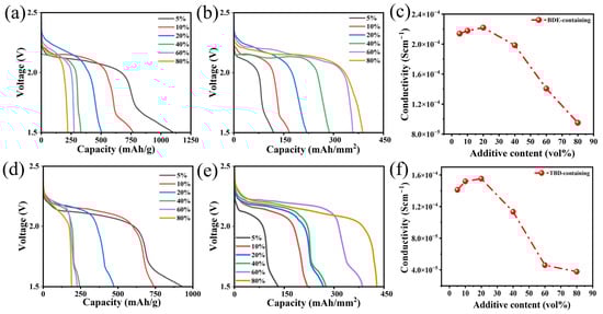 (a,d) potential–gravimetric capacity, (b,e) Potential–areal capacity, and (c,f) conductivity–additive content curves obtained using (a–c) BDE and (d–f) TBD.