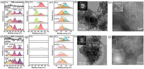 Deconvoluted (a,f) N 1s, (b,g) F 1s, and (c,h) O 1s spectra of the solid electrolyte interphases formed in the (a–c) TBD- and (f–h) BDE-containing electrolytes. High-resolution TEM images and the corresponding SAED patterns of the discharged electrodes from the (d,e) TBD and (i,j) BDE systems.