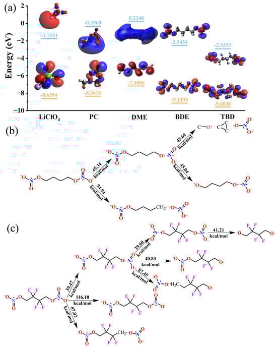 (a) Frontier molecular orbital energies of PC, LiClO4, DME, BDE, and TBD. Theoretical bond-breaking energies of (b) BDE and (c) TBD.