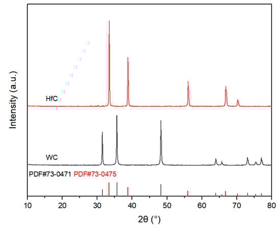 The preparation process of this study used commercially available high-purity powders as raw materials. Aluminum (Al) powder, magnesium (Mg) powder, and amorphous boron (B) powder were used as raw materials for synthesizing AlMgB14 ceramics. TiB2 powder and HfC powder were used as additives. For more detailed information regarding the manufacturers and specifications of the materials used, please refer to Table 1. The XRD patterns of the raw materials and the additives can be seen in Figure 1 and Figure 2.