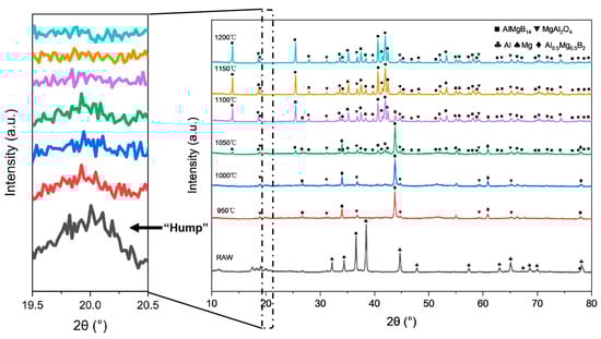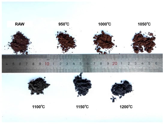The samples were heat treated at different temperatures from 950 °C to 1200 °C in steps of 50 °C. The macro-morphology of the powder exhibits significant temperature dependence (see Figure 3). In the range of 950–1050 °C, the powder maintains the loamy texture of the raw mixed powder (referred to as RAW), with its brown characteristics attributed to the mixture of unreacted amorphous boron and intermediate products of the Al-Mg-B system. When the temperature rises to 1100 °C, the color transitions to a brownish-gray transitional state. Powders treated at temperatures of 1150 °C and above completely turn gray and exhibit a sandy granular morphology.