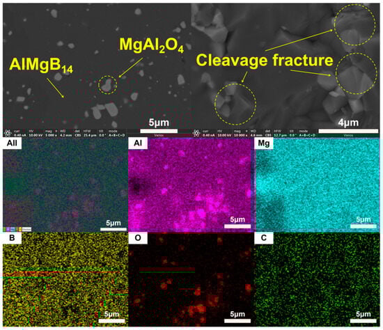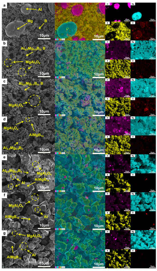 The evolutionary patterns inferred by this study are highly consistent with the reaction route proposed by Roberts et al. [42]. It also, to some extent, explains the temperature-dependent morphological evolution of Al-enriched regions, the phenomenon primarily attributed to the behavioral characteristics of metal elements during the reaction process, where some metal elements are released during the transition from low borides to high borides (AlMgB14). Metallic Mg, due to its relatively high vapor pressure [43,44,45], is more prone to loss under high-temperature conditions, making it difficult to observe in the final product; due to the relatively low vapor pressure of Al, it is possible for Al to form a melt, subsequently maintaining a near-spherical shape during the cooling process within the powder.