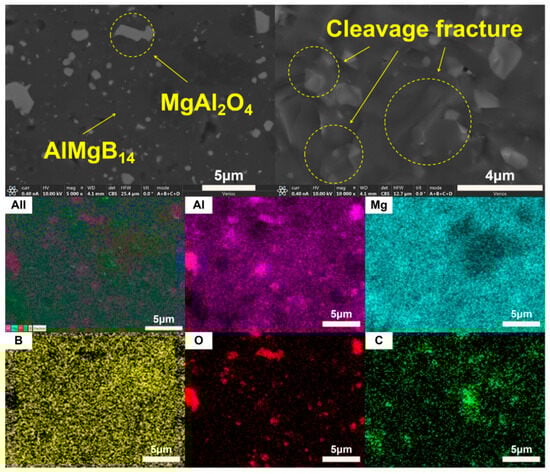 The XRD patterns of the bulk ceramic materials obtained from the sintering of the raw powder can be seen in Figure 6. It is evident that, regardless of whether the mixed powder has undergone a second round of ball milling, the main phase compositions of the sintered bulk materials are AlMgB14 and MgAl2O4. The SEM images of the polished and fracture surfaces of the bulk materials are shown in Figure 7 and Figure 8. Combining the results of the surface EDS analysis, it can be determined that the darker contrast region is the ceramic matrix phase of AlMgB14, while the brighter contrast parts are the oxide impurity phase of MgAl2O4. It is easy to observe that the MgAl2O4 phase is distributed throughout all areas of the ceramic matrix, with a relatively uniform distribution. Moreover, the bulk materials sintered from the powder that underwent a second round ball milling process exhibit more MgAl2O4 phase distribution. This is not difficult to understand, as the powder preparation process did not involve additional protection, allowing the powder to be in contact with oxygen for a longer time, which intensified oxidation and led to an increase in the oxide phase in the sintered product. Also, based on the diffraction peaks of the matrix phase, it can be seen from the XRD patterns that the relative intensity of the diffraction peaks of the oxide phase in RAW-D was slightly higher than that in RAW-S. There were a certain number of pores in the ceramic material, which could possibly have been caused by the volatilization loss of substances such as B2O3 during the high-temperature sintering process [50,51,52,53]. Further research is needed to determine the form mechanism of pores.