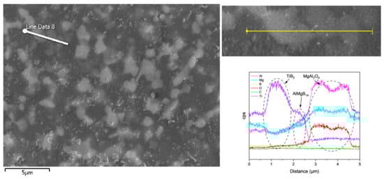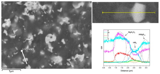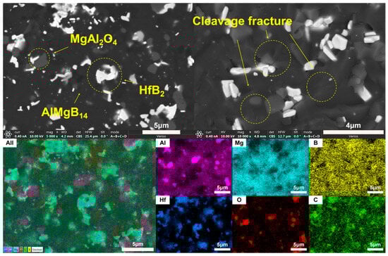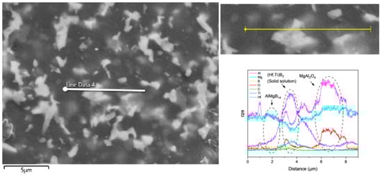 In the ceramic composite material with HfC added, the main phase compositions (see Figure 9) were AlMgB14, HfB2, and MgAl2O4. After adding HfC, a new phase of HfB2 was formed, and the diffraction peak of the additive HfC itself could no longer be detected by XRD characterization. In the region of 2θ = 35–45°, extremely weak diffraction peaks of Al-Mg alloy and Al3B48C2, as well as some low-boron compounds such as the weak diffraction peak of AlB12, can be detected. Al3B48C2 is an isomer (β-AlB12) [54] of the decomposition product AlB12 of the ceramic matrix AlMgB14. Further research is needed to confirm the existence of these substances. According to the line scan results (see Figure 12), the variation of Hf element requires a relatively long distance to reach the peak concentration. There may be a reaction layer between the second phase and the ceramic matrix. The size of the HfB2 phase was about 1–2 μm, and the shape of this second phase was irregular. Agglomeration of some second phase particles can be observed (see Figure 13), and large second phase particle clusters could reach over 6 μm.