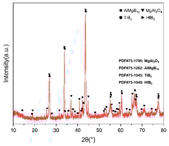 For bulk materials prepared using only one additive, the XRD patterns are shown in Figure 9. In the case of preparing ceramic composites using TiB2, the main phase composition of the sintered bulk material is AlMgB14, TiB2, and MgAl2O4.
