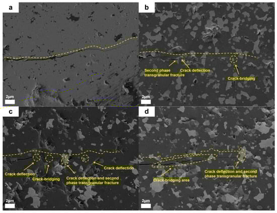 As shown in Figure 18, the microscopic morphology analysis of the crack propagation path in bulk materials revealed that the samples without additive exhibited long, straight cracks with unobstructed propagation, whereas the modified samples all displayed significant toughening characteristics. In the dual-component synergistic composite system, the cracks showed a short-range twisted morphology accompanied by a typical bridging effect. The second phase formed a stress barrier by bridging the two sides of the crack, effectively absorbing the propagation energy and inhibiting crack extension. Notably, in the synergistic composite samples, the second phase not only triggered crack path deflection but also directly terminated the crack tip propagation through pinning action. This multi-scale synergistic mechanism has become the key factor in enhancing the material’s fracture toughness. These results indicate that the comprehensive mechanical properties of ceramic materials can be effectively optimized by rationally designing and introducing appropriate secondary phase additives.