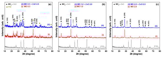 X-ray diffraction (XRD) patterns of hydrothermally synthesized WO3 nanosheet arrays and WO3/ZnO nanocomposites on FTO glass substrates. The WO3 growth times are (a) 0.5 h, (b) 1.0 h, and (c) 2.0 h.