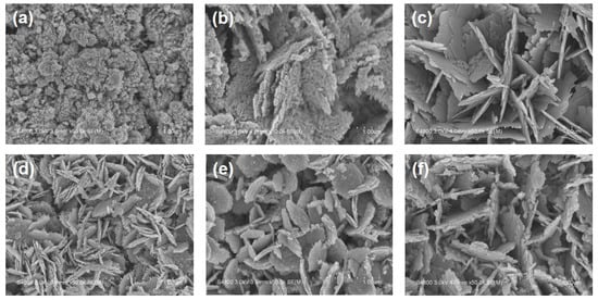 Plan-view field-emission scanning electron microscopy (FE-SEM) micrographs of (a–c) WO3 nanosheet arrays and (d–f) WO3/ZnO nanocomposites deposited on FTO glass substrates. WO3 was grown for 0.5 h (a,d), 1.0 h (b,e), and 2.0 h (c,f), respectively. For the nanocomposites (d–f), ZnO was deposited with a fixed growth time of 2.0 h following WO3 growth.